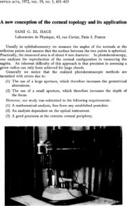 Jusqu’à cette époque, l’adaptation des lentilles de contact de tous types, y compris l’OrthoK, était principalement basée sur la kératométrie manuelle (Javal ou Sutcliffe) et la réfraction lunettes. Cette situation a commencé à changer à la fin des années 1970, lorsque Sami El Hage, OD, PhD, a décrit, dans le Laboratoire de Physique à Paris, l’utilisation de la « Photokeratoscopy and Controlled Kerato Reformation » (CKR), son terme pour l’orthokératologie.